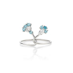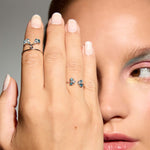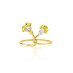 Interlocking floral motives comprised of coloured and colourless diamonds. The poetry ring is crafted by hand in 18ct gold with 0.21cts of blue, pink or yellow diamonds, a 0.10ct oval and a 0.10ct marquise diamond.