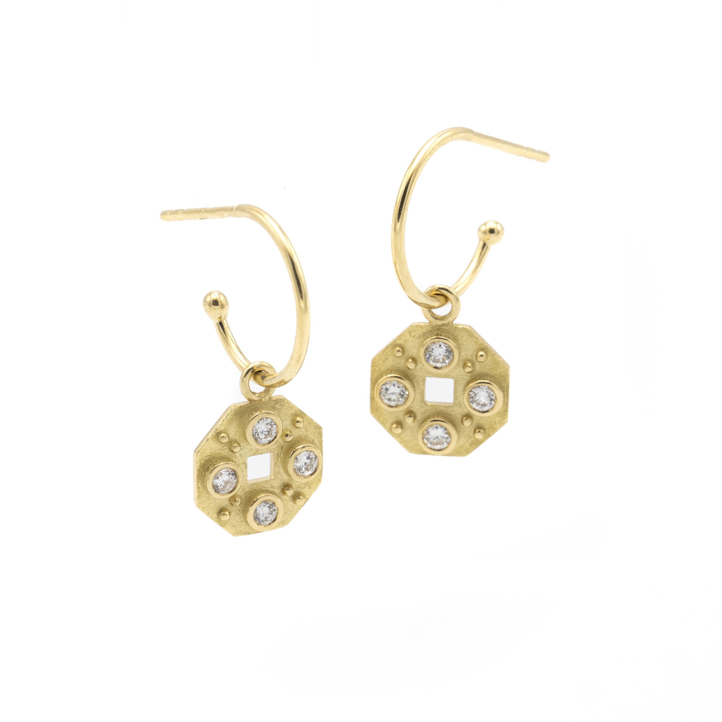 Hand cut windows into the past with a modern twist, our Theadora hoops are versatile and can be worn with and without the dangling charms. Set with 0.24 cts of round brilliant cut diamonds, these are the hoops will be your daily companion. Sold as a pair.