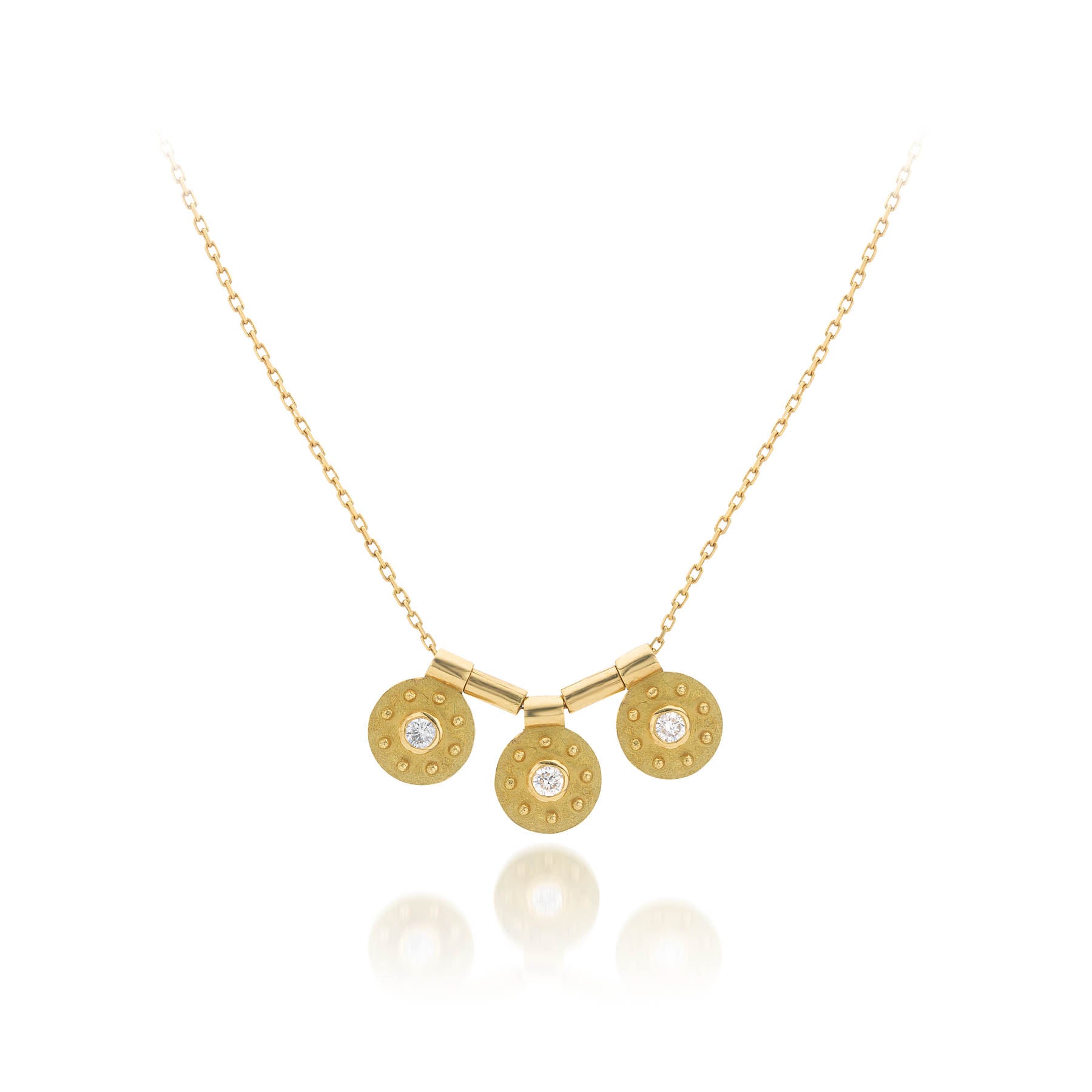 Byzantine craftsmanship meant a special attention to detail. We've taken the traditions of goldsmithery and handmade every bead and charm that rest imperfectly perfect on your neck. Our Zoe Three is strung together with miniature medallions featuring 0.09cts of round brilliant cut diamonds.