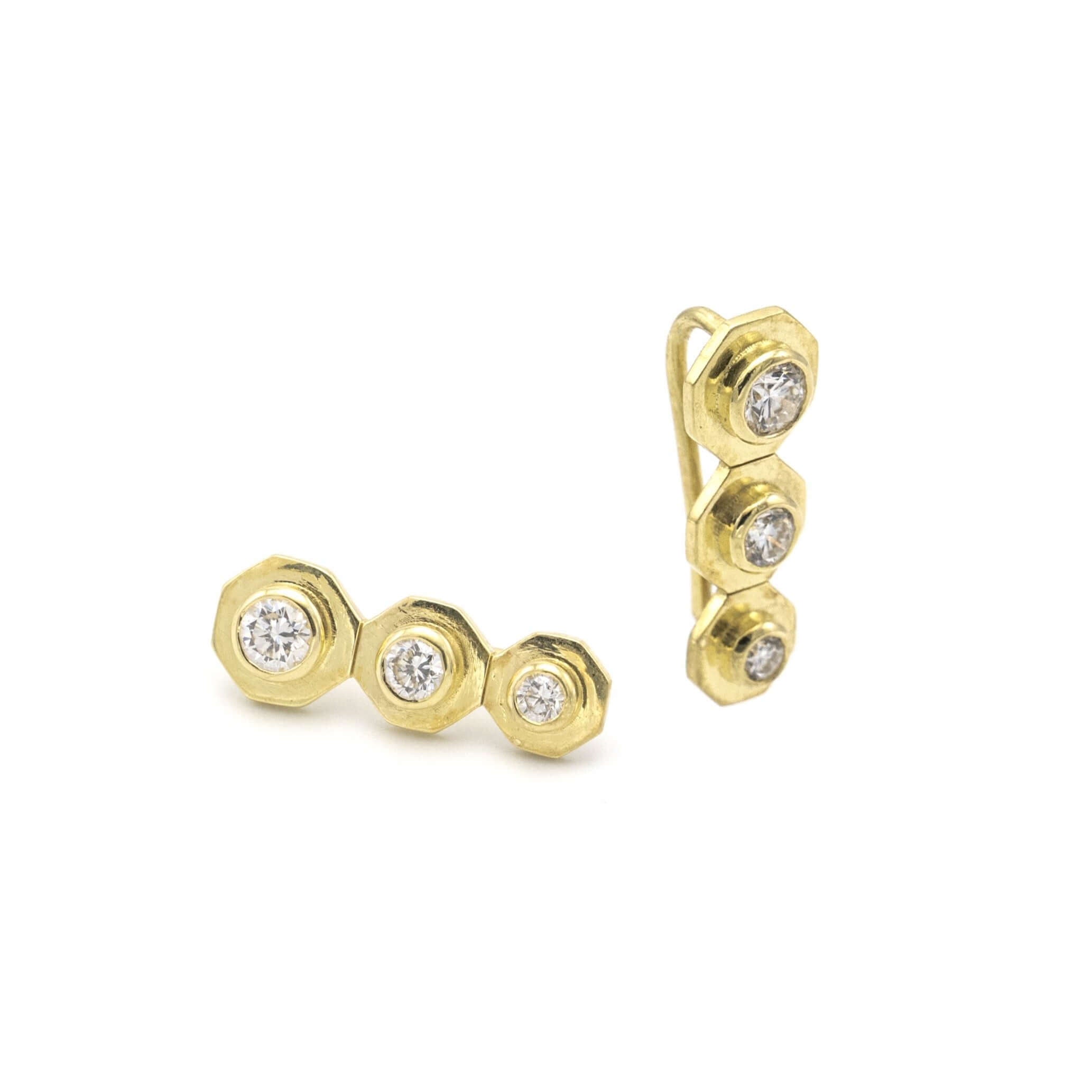 The Octagon is a symbol of rebirth and renewal. This structural shape of the Renaissance becomes a frame for the modern diamond. Our climbers feature 0.38cts of round brilliant cut diamonds set against warm yellow gold. Sold as a pair.