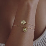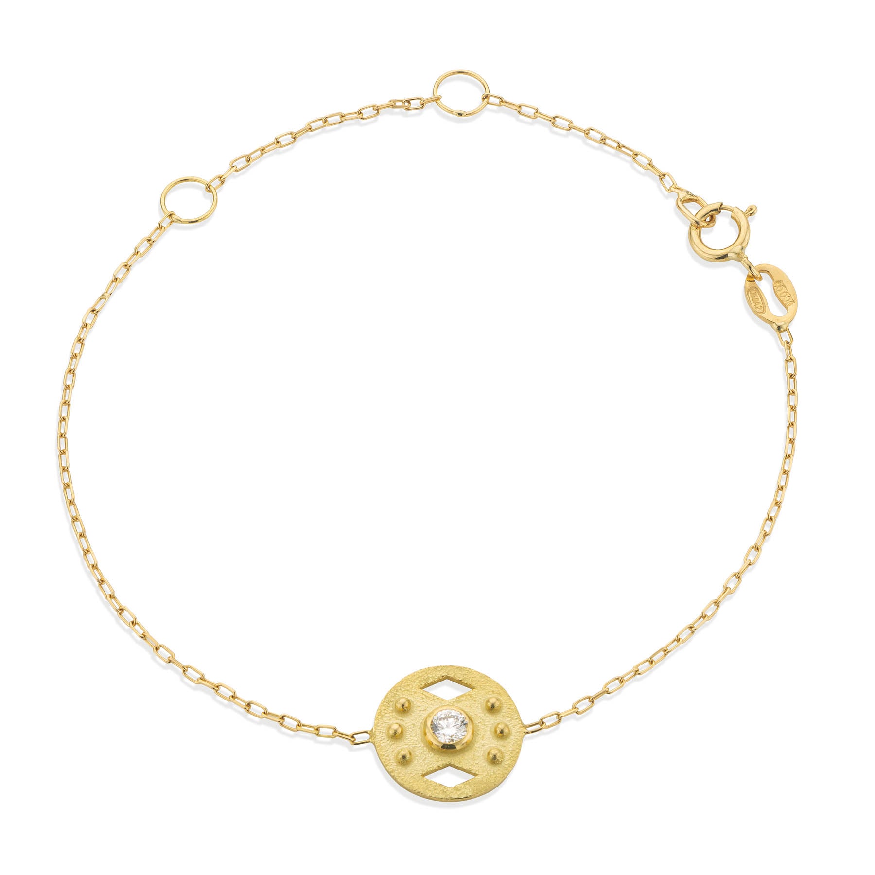 Inspired by an era of artistic richness and symbolism the Zoe Bracelet is lightweight and easy to wear. With a hand cut medallion featuring a 0.06ct brilliant cut diamond that captures the energy of both ancient and modern times.