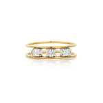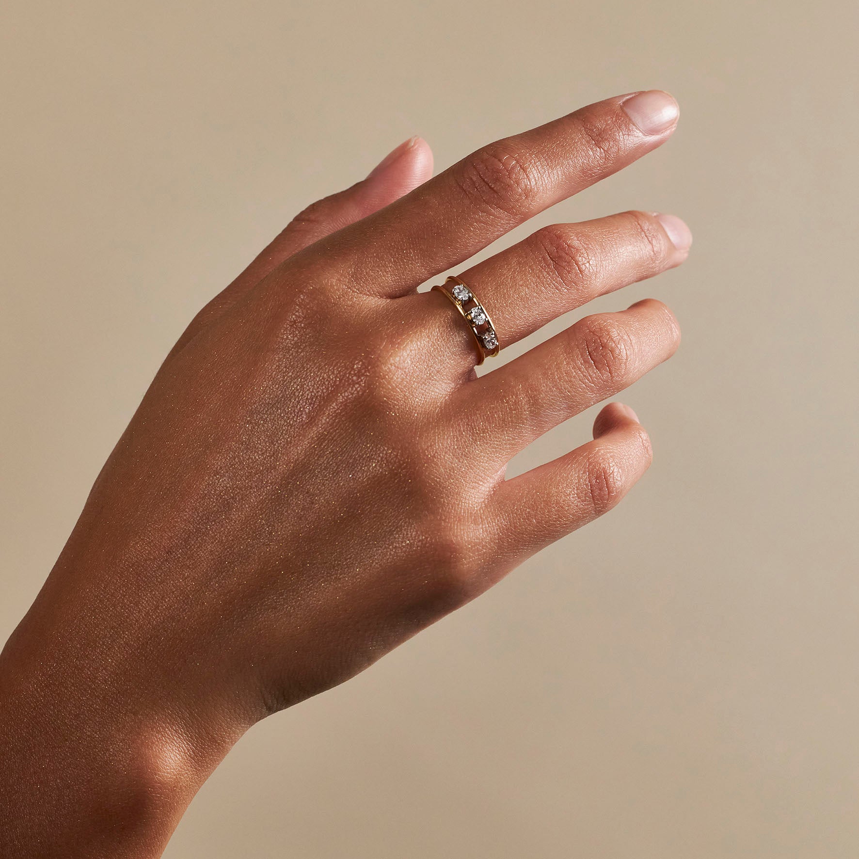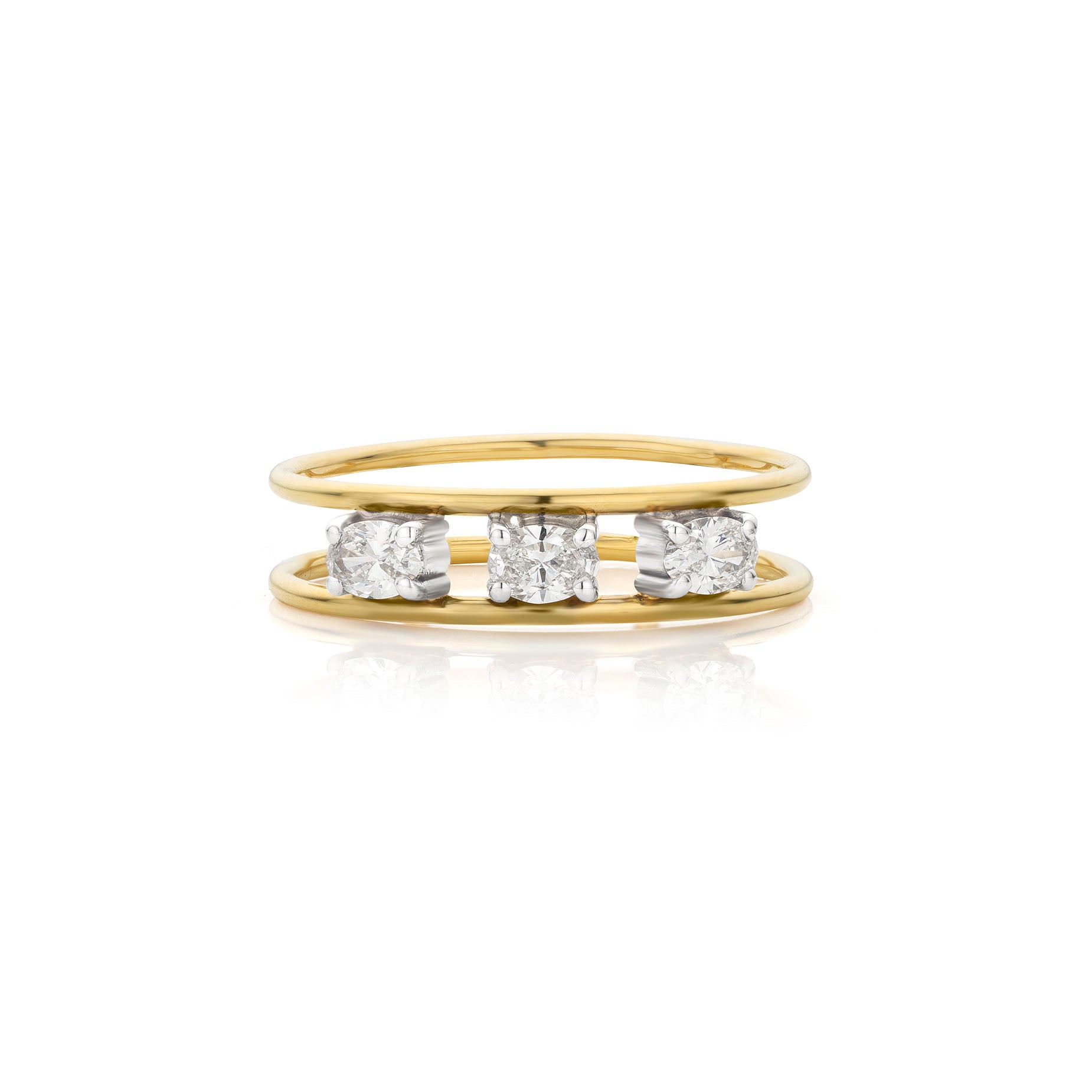 Three diamonds that float between slender bands of gold. Featuring 0.30cts of brilliant cut oval diamonds that are set to capture the light around you. Handcrafted to be feather light, this modern band is as unique as your story.