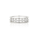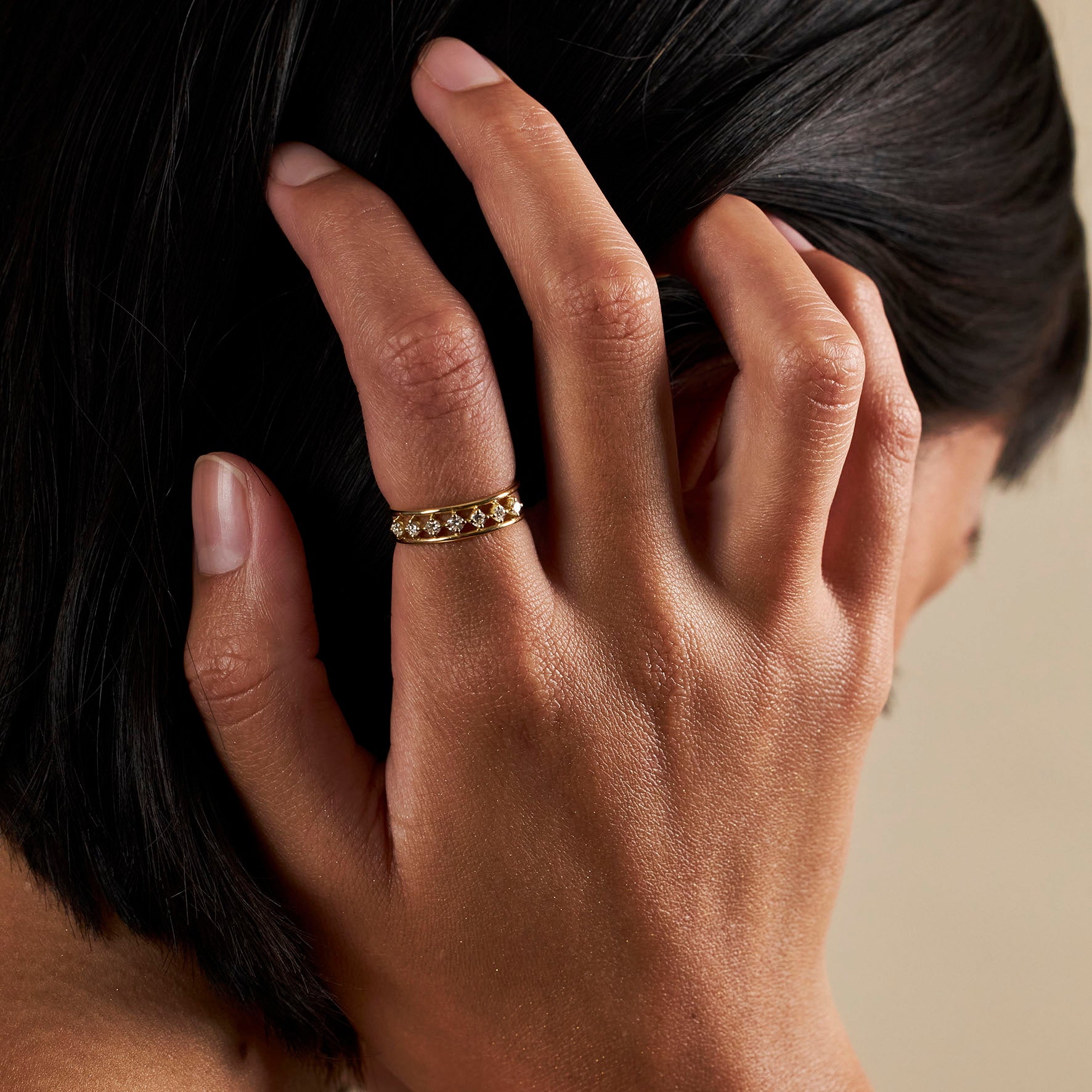 A ring that captures the stolen moments between now and forever. Filling the space between two bands with 0.21cts of round brilliant cut diamonds. We like to describe it as modern, minimal and magical.